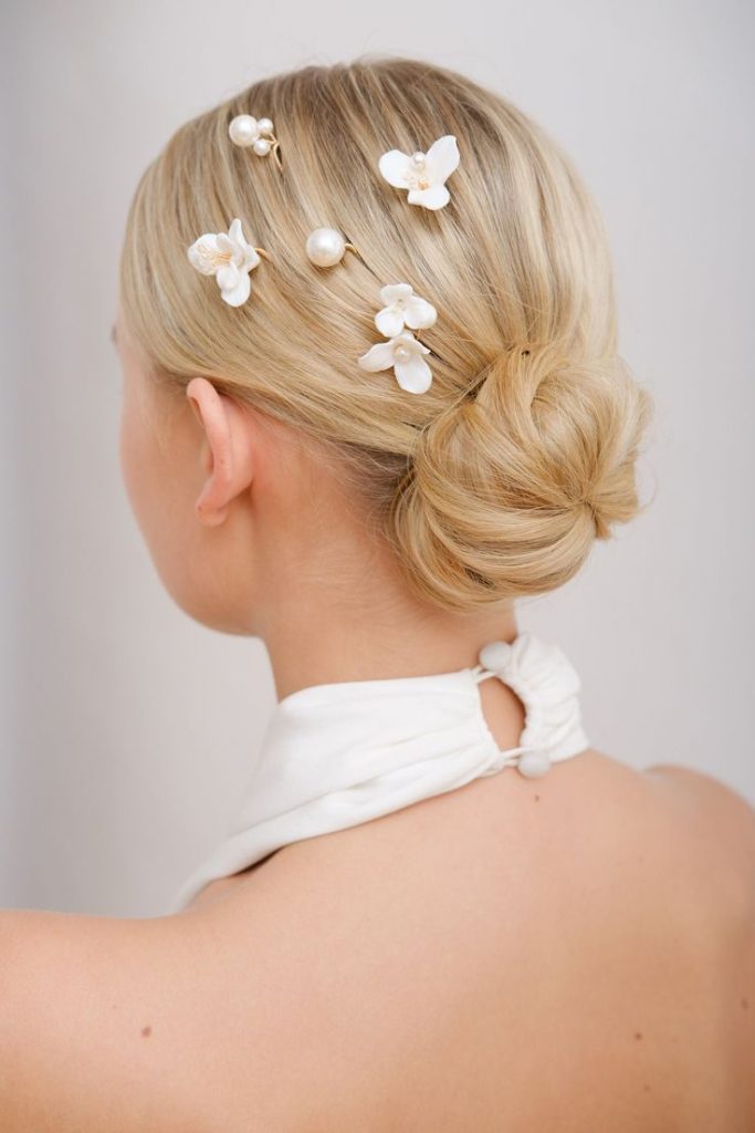 Subtle Charm: Pearl and Flower Accents in a Low Bun