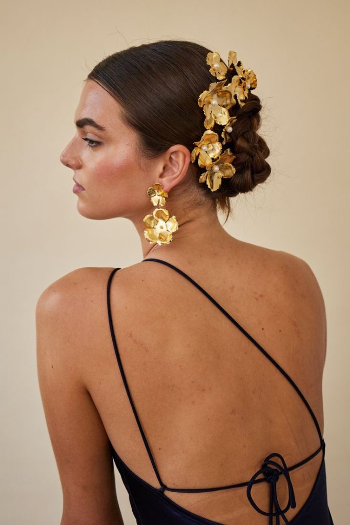 This hairstyle makes a bold statement with gold-toned floral accessories embedded in a complex updo. It’s an ideal choice for high-profile events, where making a stylish impact is key. The golden flowers add a luxurious touch, making it a suitable option for glamorous weddings or even red-carpet events, providing a rich, opulent look.