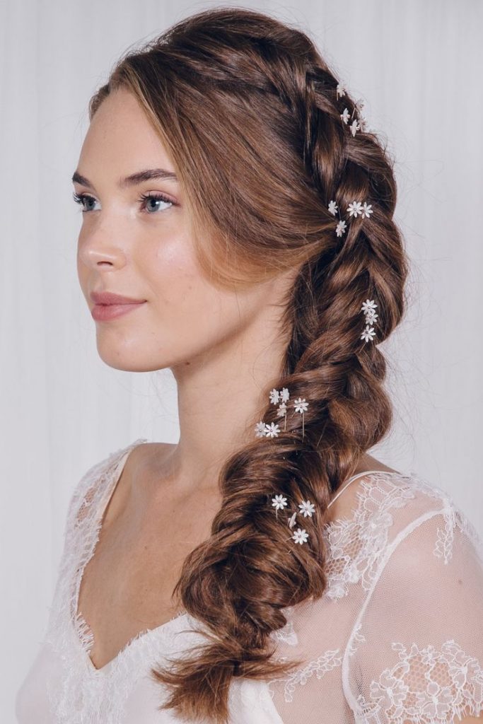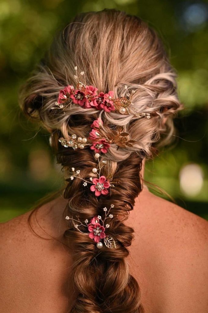 Capturing a whimsical aesthetic, this hairstyle features a long braid adorned with tiny white flowers, evoking a fairy-tale charm. It’s perfect for outdoor weddings or bohemian-themed events, where natural elements play a key role in the decor and styling. The small flowers intertwined along the braid offer a delicate, dreamy vibe that enhances the romantic feel of the hairstyle.