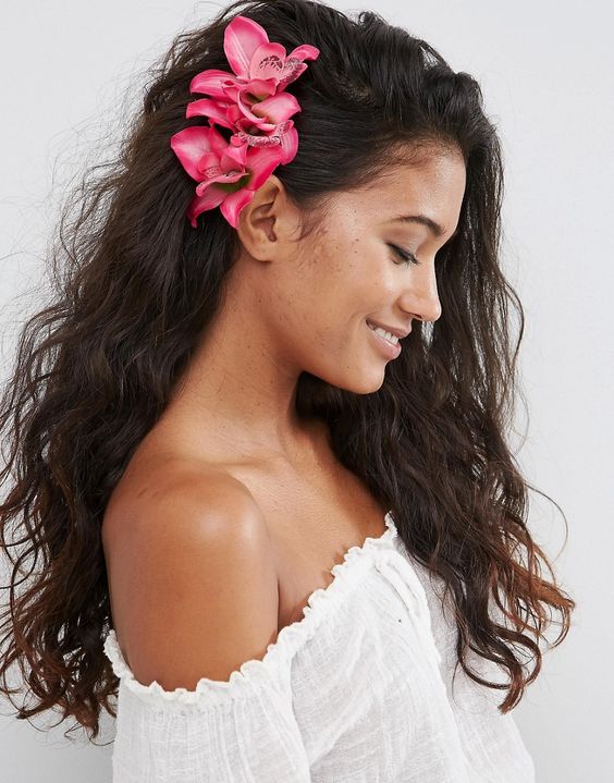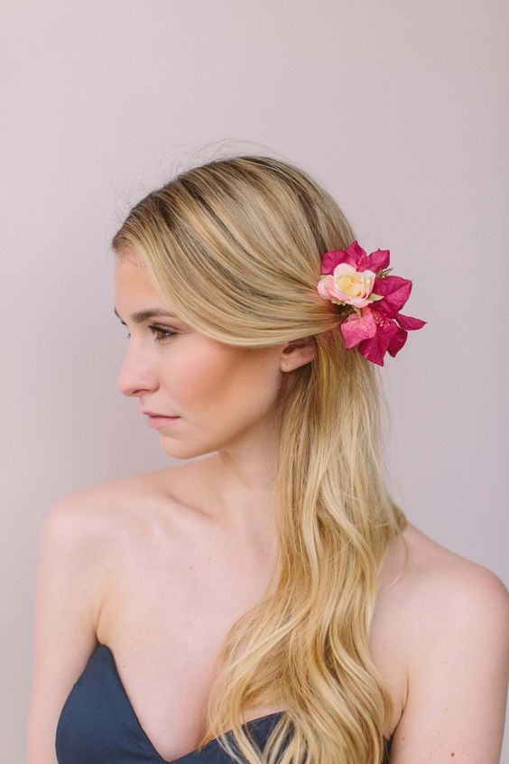 In a delicate blend of simplicity and elegance, this hairstyle uses a bold pink flower to add a touch of romantic flair to soft, side-swept blonde locks. The style is ideal for a summer date or a casual wedding, providing a sweet and subtle hairstyles with flowers option that doesn’t overwhelm but instead perfectly complements a light, airy outfit.