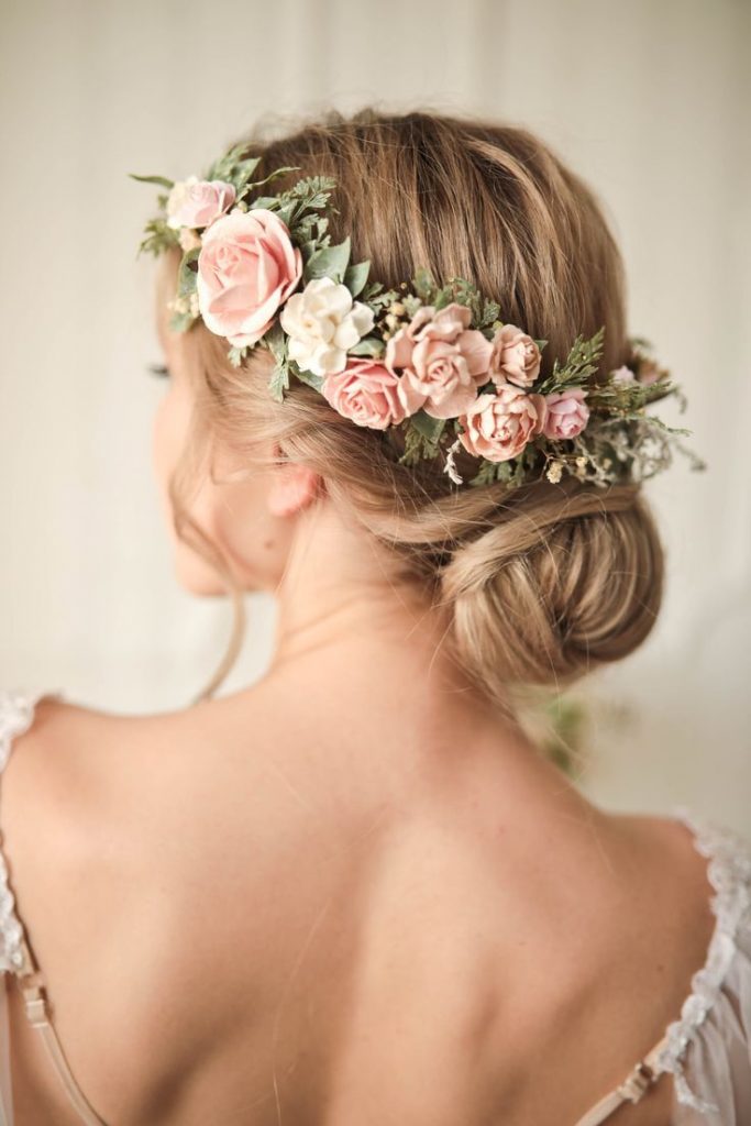 An intricate and detailed flower crown wraps around a beautifully styled updo, creating a look reminiscent of an enchanted garden. This style is particularly well-suited for a bridal look, with its combination of soft pink roses, smaller white flowers, and green foliage offering a natural yet sophisticated vibe. The crown itself acts as a statement piece, perfect for outdoor or springtime weddings.