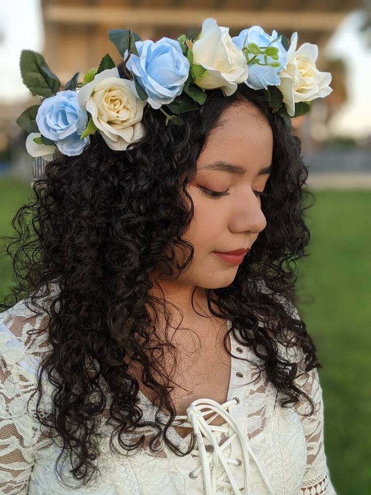 The final hairstyle is a serene and beautiful arrangement featuring a crown of blue and white roses set against dark, flowing curls. This crown provides a tranquil, almost ethereal quality to the hairstyle, making it suitable for special occasions like garden parties or as a distinctive prom hairstyle. The cool tones of the flowers contrast beautifully with the warmth of the curls, creating a stunning visual balance that is both calming and striking.