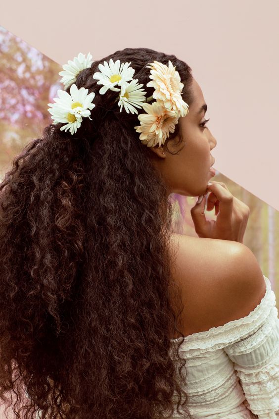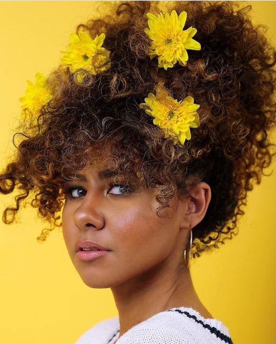 A vibrant example of hairstyles with flowers for black women, this style incorporates bright yellow flowers scattered playfully throughout a voluminous curly updo. It’s a joyful and energetic style that could easily transition from a casual day out to a more festive gathering like a prom or even a themed party. This hairstyle celebrates natural hair texture, enhancing it with pops of color that evoke a sense of fun and spontaneity.