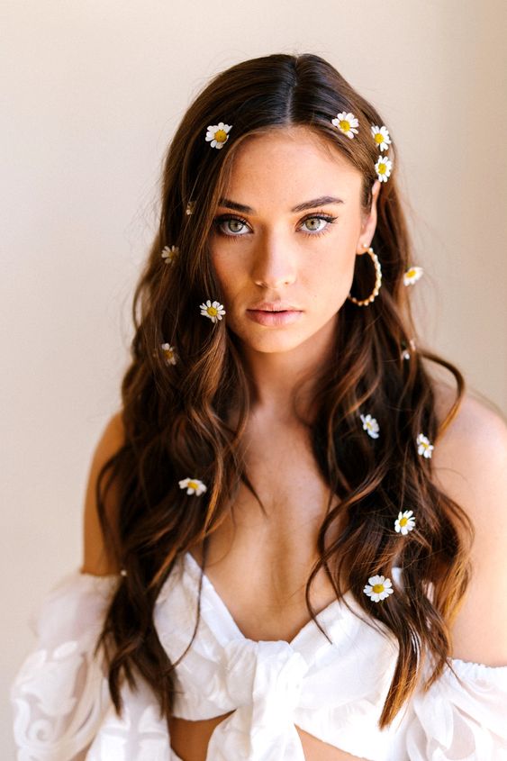 For younger audiences, especially for prom events, the inclusion of tiny daisies offers a fresh, youthful vibe. The model in the image wears her long, brunette hair down with scattered daisy embellishments, embodying a free-spirited and cute aesthetic. This approach to hairstyles with flowers makes it accessible and appealing for teenagers looking to add a touch of nature to their prom attire.