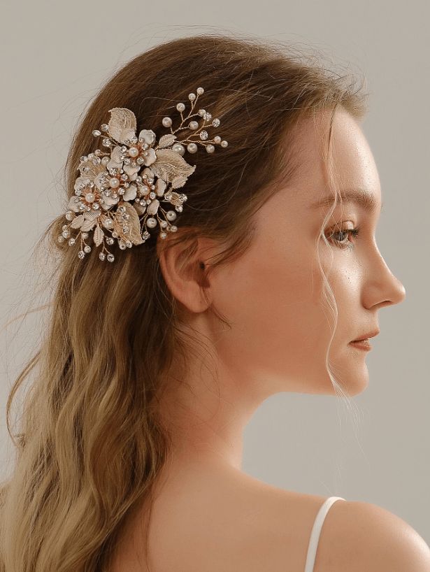 Moving to a more sophisticated bridal look, this hairstyle features a stunning side piece composed of metallic flowers and pearls. The design is intricate, suggesting both luxury and the delicate nature of a bridal ensemble. Positioned on lightly waved hair, it complements the subtle beauty of the bride, making it an excellent choice for a classical wedding.