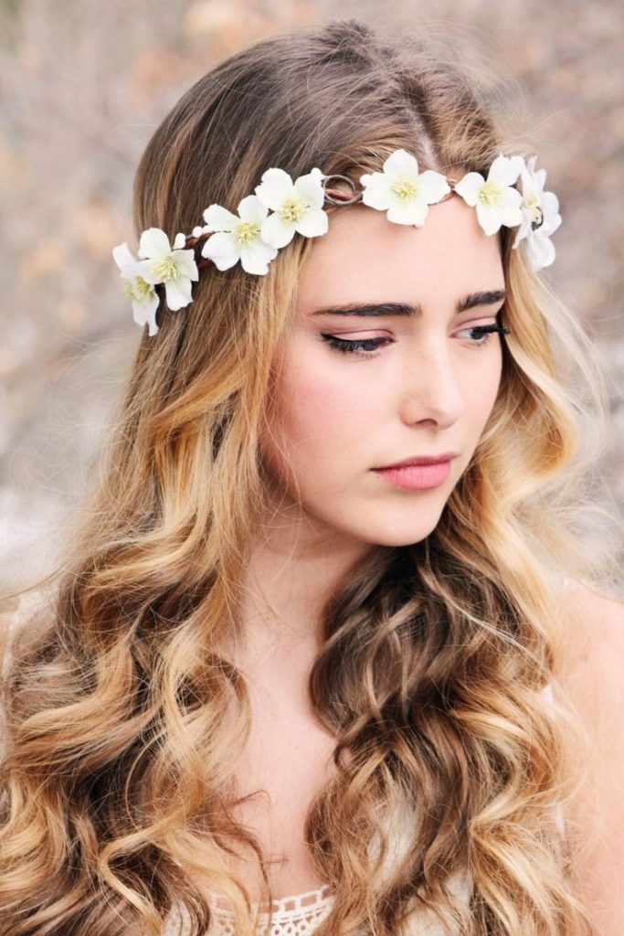 The final image captures the essence of bohemian beauty, featuring a young woman adorned with a delicate white flower headband across her forehead, paired with flowing wavy hair. This style is perfect for both bridal and casual settings, where simplicity and elegance need to intersect seamlessly.