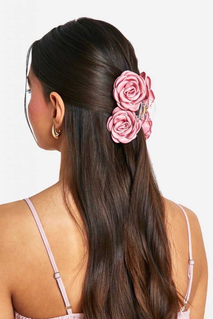 Here, we see a sleek, straight hairstyle embellished with deep pink rose clips positioned close to the scalp. This look could be ideal for both romantic dinners and formal events, where the addition of flowers brings a gentle touch of nature to a refined, modern hairstyle. The simplicity of the style combined with the elegance of the roses makes it versatile and stylish.