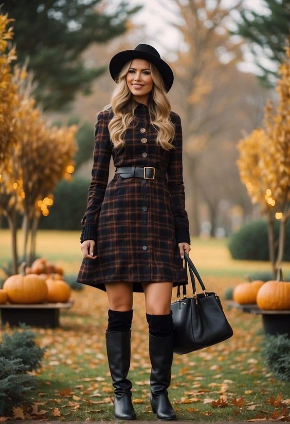 Plaid is synonymous with fall fashion, and this plaid dress captures the essence of the season beautifully. The dress features a belted waist, which accentuates the figure and adds a touch of classy refinement. Paired with black knee-high boots and a matching black hat, this look is perfect for a romantic evening at a pumpkin patch or a cozy dinner. The overall aesthetic is polished yet relaxed, making it a great option for those who want to look effortlessly put-together.