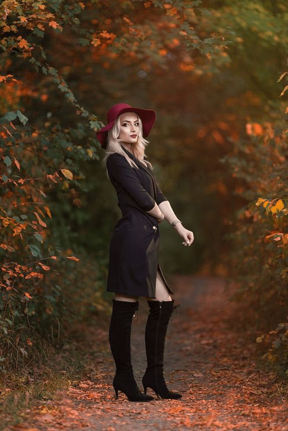 For a more baddie date night vibe, this all-black outfit is both striking and mysterious. The sleek black dress is paired with thigh-high boots, creating a bold and confident look that’s perfect for a night out. The deep burgundy wide-brimmed hat adds a pop of color and a hint of drama to the ensemble. This outfit is ideal for an evening date where you want to make a strong impression while embracing the fall season’s darker hues.