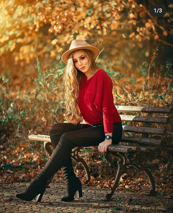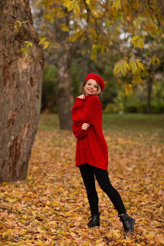 This outfit is perfect for a casual yet chic date night. The red sweater adds a pop of color, while the black leggings keep the look sleek and simple. Paired with black knee-high boots and a beige hat, this outfit strikes the perfect balance between comfort and style. It’s an excellent choice for an evening walk, a coffee date, or even a relaxed dinner. The bold color of the sweater makes it a standout piece, ensuring you’ll turn heads wherever you go.