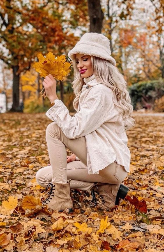 For those who love a more neutral palette, this outfit offers a cozy yet stylish option. The cream-colored corduroy jacket paired with beige pants and lace-up boots creates a monochromatic look that’s both chic and comfortable. The addition of a fuzzy bucket hat adds a playful touch, making this outfit perfect for a casual fall date. This ensemble is versatile and flattering, making it a great option for a variety of fall activities.