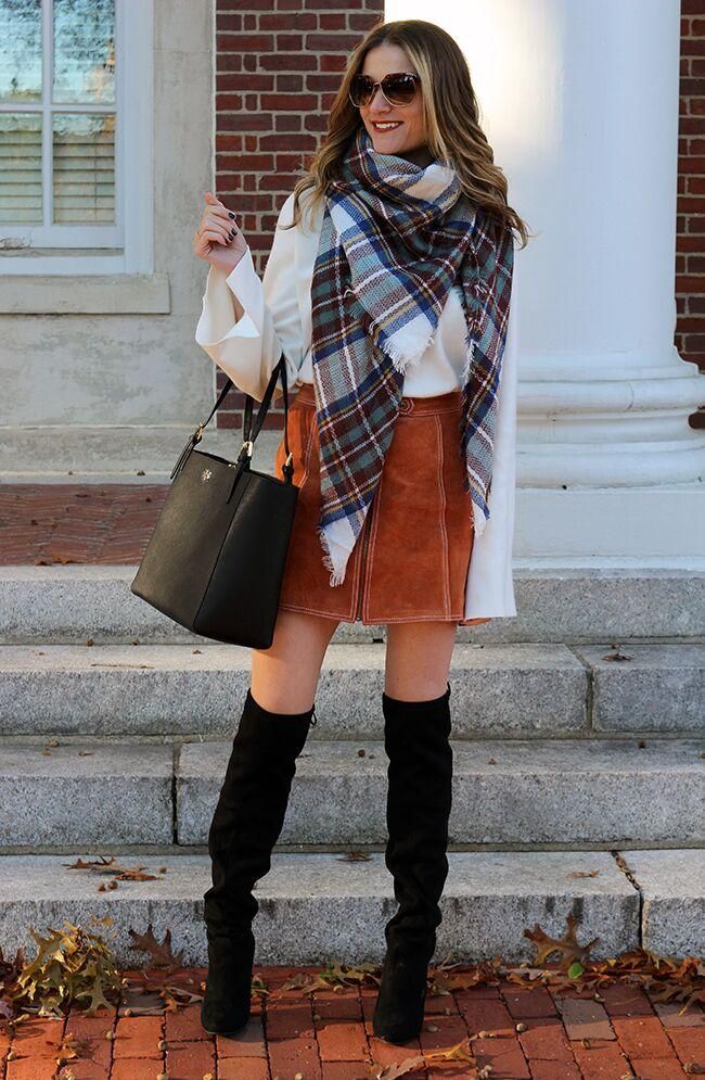 Suede and fall go hand in hand, and this outfit showcases how to do it right. The rust-colored suede skirt is the star of this ensemble, paired with a white blouse for a classy touch. The over-the-knee black boots add a dash of sophistication, elongating the legs and bringing a touch of glamour to the look. The oversized scarf not only keeps you warm but also adds texture and depth to the outfit. This is an ideal choice for a women’s date night outfit that is both classy and a bit daring, perfect for a dinner date or an evening out in the city.