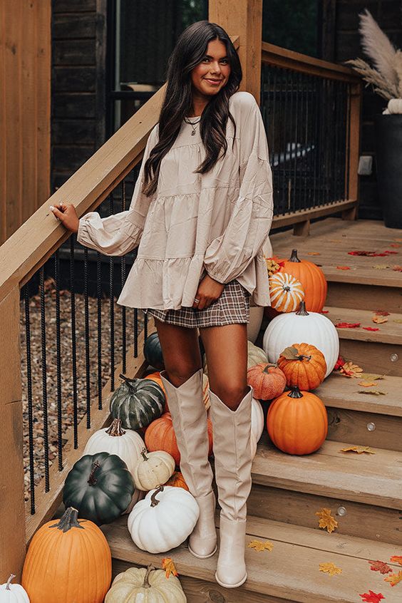 For those who prefer a more subdued palette, this neutral-toned outfit is perfect for a casual date night. The beige oversized top paired with a plaid mini skirt creates a look that is relaxed yet put-together. The knee-high beige boots elongate the legs and add a touch of sophistication to the otherwise laid-back ensemble. This outfit is perfect for an afternoon date that transitions into evening, offering both comfort and style.