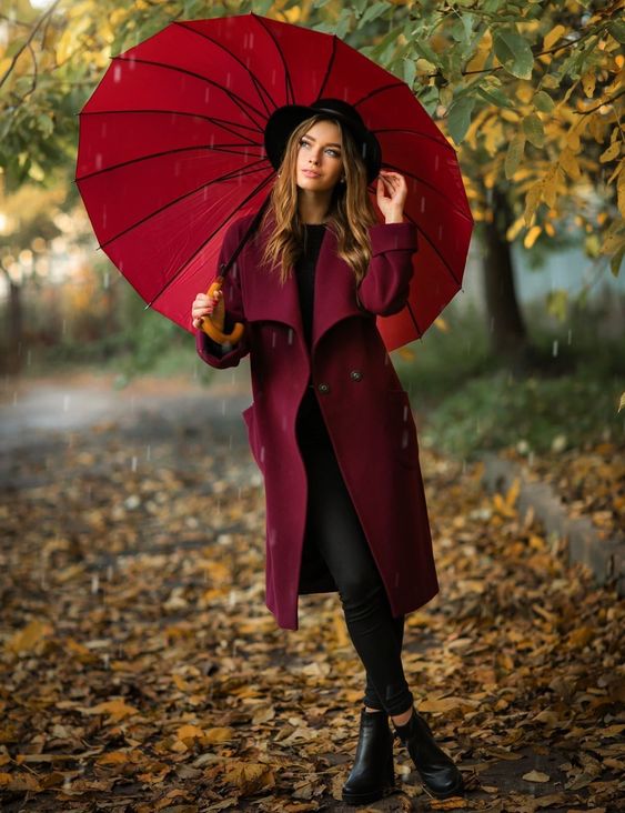 Burgundy is a color that screams fall, and this outfit takes full advantage of that. The burgundy coat paired with black leggings and ankle boots creates a look that is both classy and weather-appropriate. The wide-brimmed hat and matching burgundy umbrella add a touch of drama, making this outfit perfect for a rainy date night. This look is ideal for women who want to make a stylish impression without going over the top, and it works well for a variety of sizes.