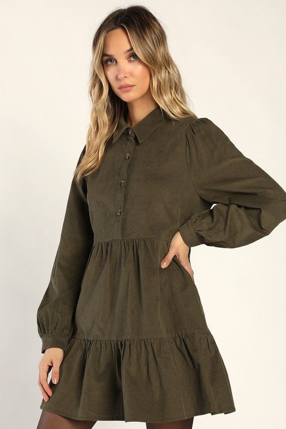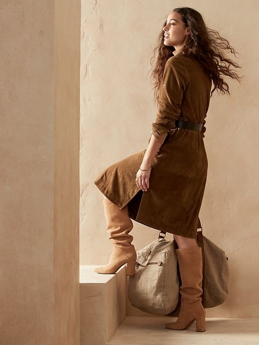 Olive green brings a new dimension to the suede dress outfit for fall. This shirt dress with its waist-defining tie and button-down front is as versatile as it is stylish. Paired with beige suede ankle boots, it transitions seamlessly from office to evening.