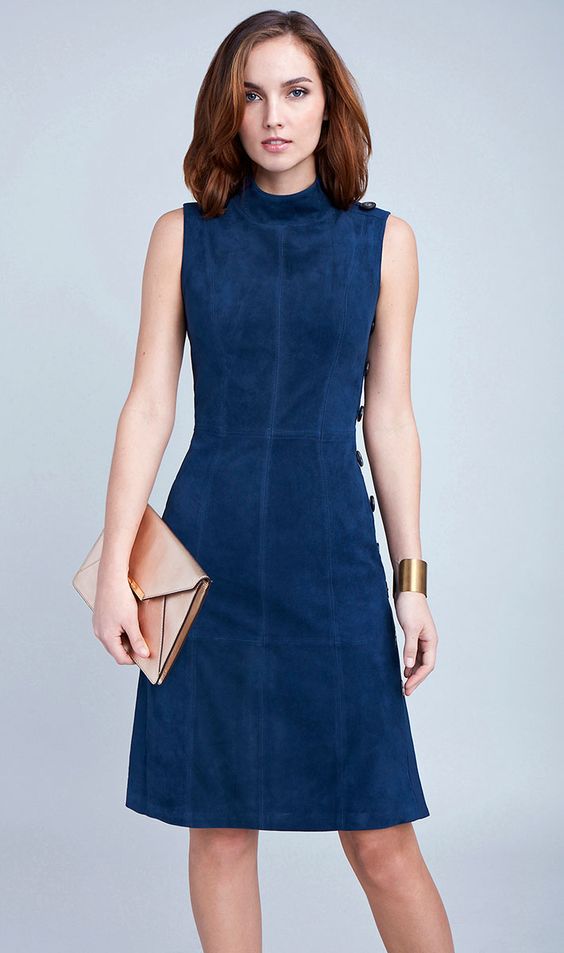 A structured blue suede dress outfit channels a smart and modern vibe. The dress’s clean lines are complemented by subtle side buttons, making it an excellent choice for professional settings. Accessorize with a geometric clutch and bold cuff for a work-ready summer ensemble.