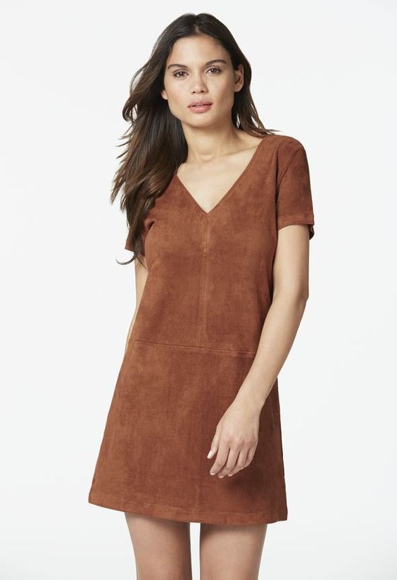 The A-line silhouette of this tan suede dress outfit offers a flattering shape for any occasion. With a simple V-neck and short sleeves, it’s the epitome of a spring or summer staple that pairs well with minimalist accessories and a relaxed attitude.