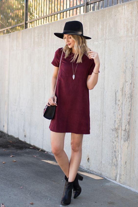 The deep maroon of this suede dress adds a touch of drama to your wardrobe, making it a stunning choice for a winter or fall evening. Its simplicity allows for bold accessory choices, like a wide-brimmed hat or statement jewelry, amplifying the suede dress outfit with boots.