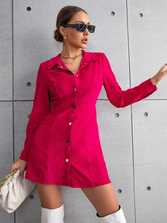 A bold pink suede dress makes a striking statement. With clean lines and a classic shirt-dress design, this suede dress outfit is a perfect canvas for fall fashion. Pair with white boots for a contrast that pops, or keep it tonal with similar shades of pink accessories.