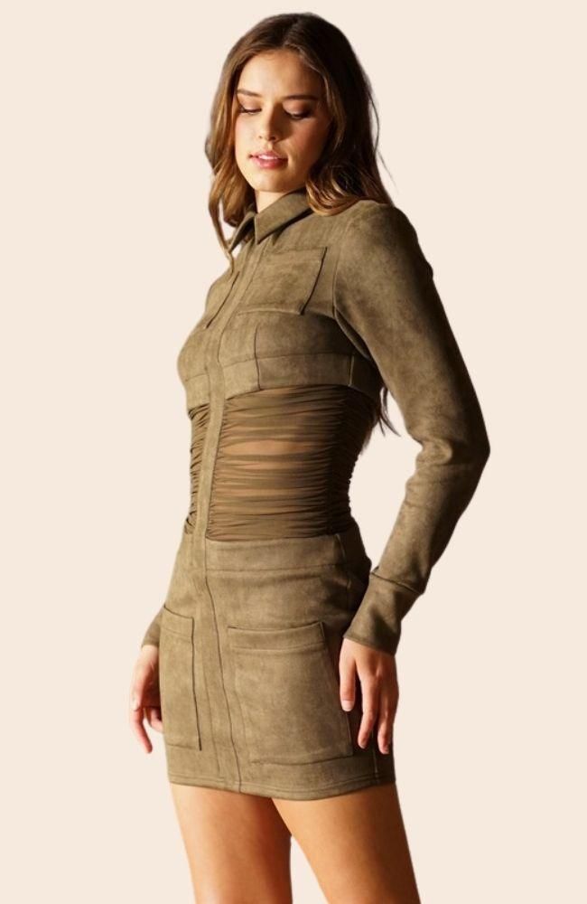 A military-inspired suede dress outfit with structured shoulders and cinched waist showcases power dressing with a feminine twist. Its unique detailing sets it apart, making it a great choice for an unconventional yet stylish work or evening outfit.