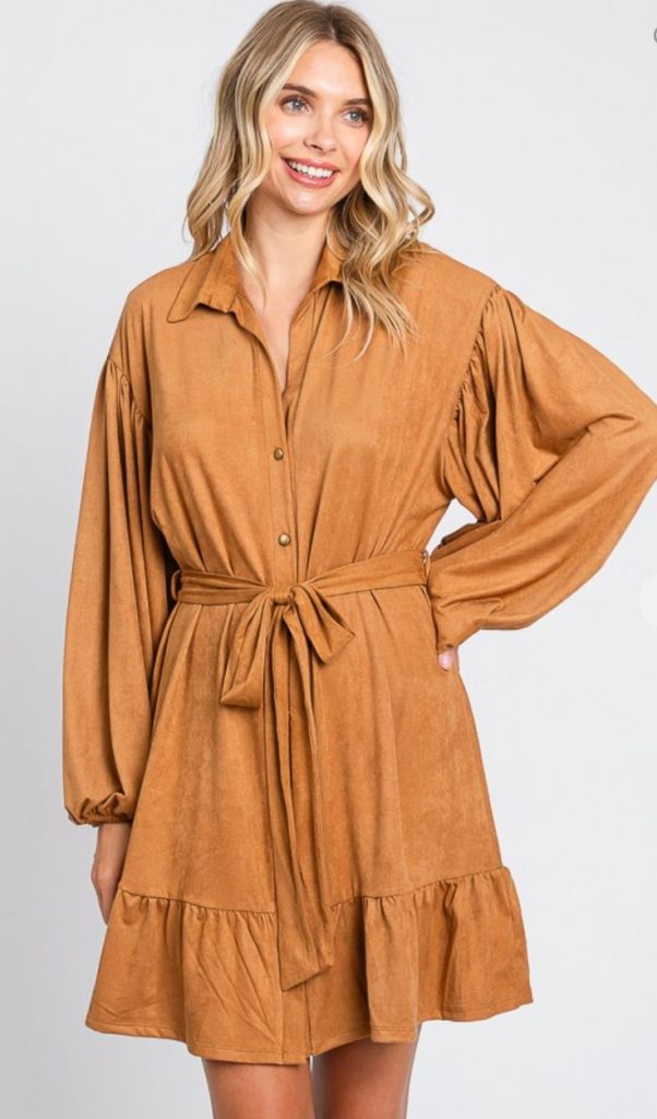The playful ruffles of this brown suede dress outfit bring a youthful vibrance to any wardrobe. It’s easy to dress up with heels or down with flats, making it a versatile piece for spring and fall alike.