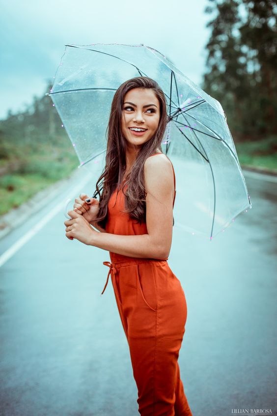 A fiery orange jumpsuit under a clear umbrella with delicate pink trim radiates confidence. The jumpsuit, cinched at the waist with a tie, offers a playful yet sophisticated hot rainy day outfit summer work look. It’s ideal for an office that appreciates a pop of color or a chic summer date.