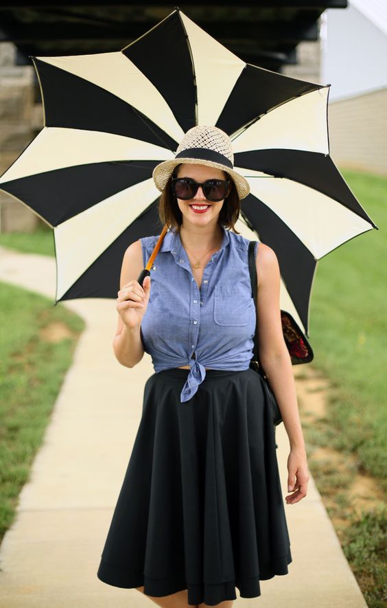 A striped umbrella in classic black and white is the focal point of this hot rainy day outfit summer ensemble. A simple denim top knotted at the waist gives a nod to the casual ease of spring, while a black A-line skirt adds a touch of sophistication. Accessories like a straw hat and chic sunglasses make this outfit ideal for a laid-back, yet stylish summer work environment.