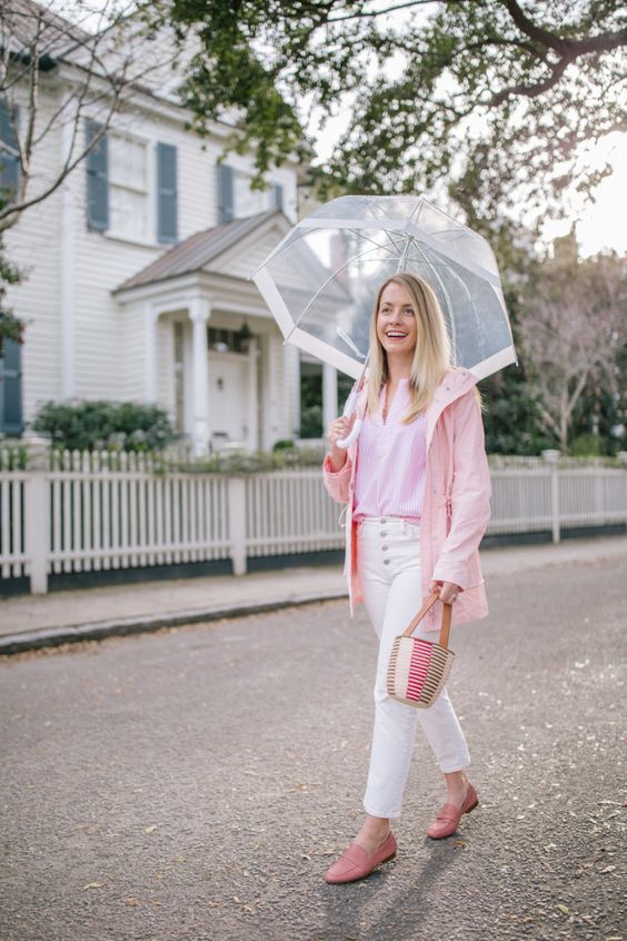 Embrace the softness of summer with a pastel pink raincoat and a clear umbrella. White denim and light pink loafers round off a hot rainy day outfit summer comfy that’s as cozy as it is cute. This look is a testament to keeping things light and airy, even when the weather is not.