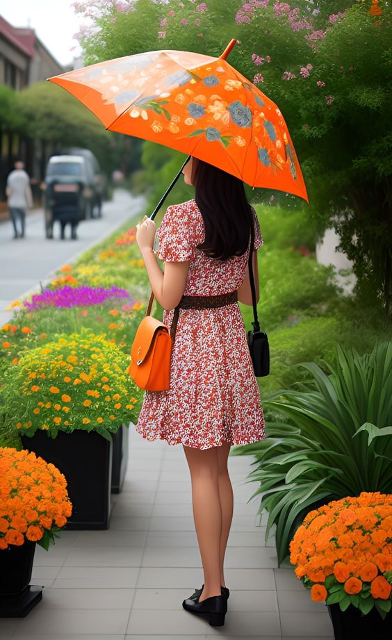 An orange floral umbrella and a print dress encapsulate the essence of a garden in bloom. This is your go-to hot rainy day outfit summer casual for a walk in the park or a casual meet-up with friends.