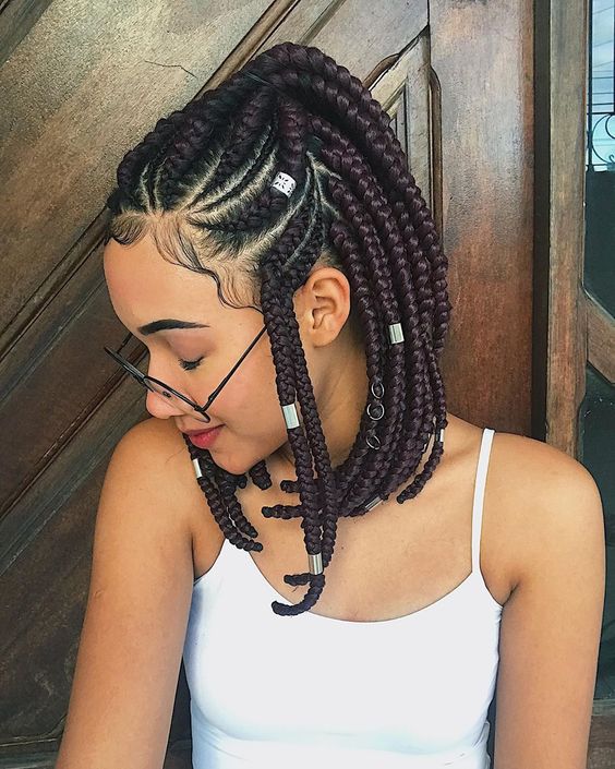 Burgundy twist braids styled in a bob length with silver accessories for added flair. The short, chic style is complemented by well-defined baby hairs, making it a playful and fresh choice for a stylish, youthful vibe.