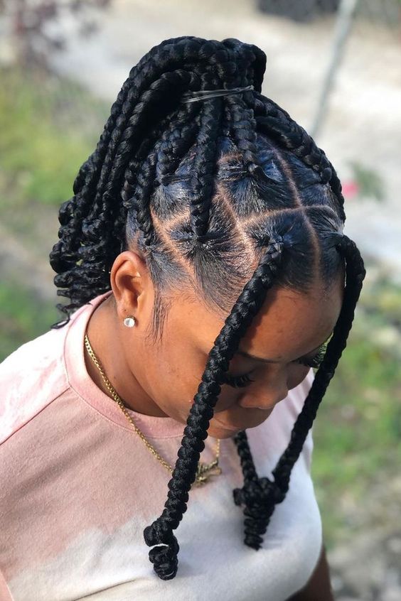 These twist braids are styled into a high ponytail, highlighted by triangle parting. The detailed parting adds a unique dimension to the look, making it bold and ideal for those who love statement hairstyles.