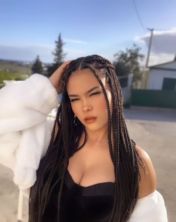 This hairstyle features long jumbo twist braids with sleek edges and baby hairs for a polished look. The large twists offer volume and elegance, perfect for those seeking a sophisticated, dramatic style that draws attention.
