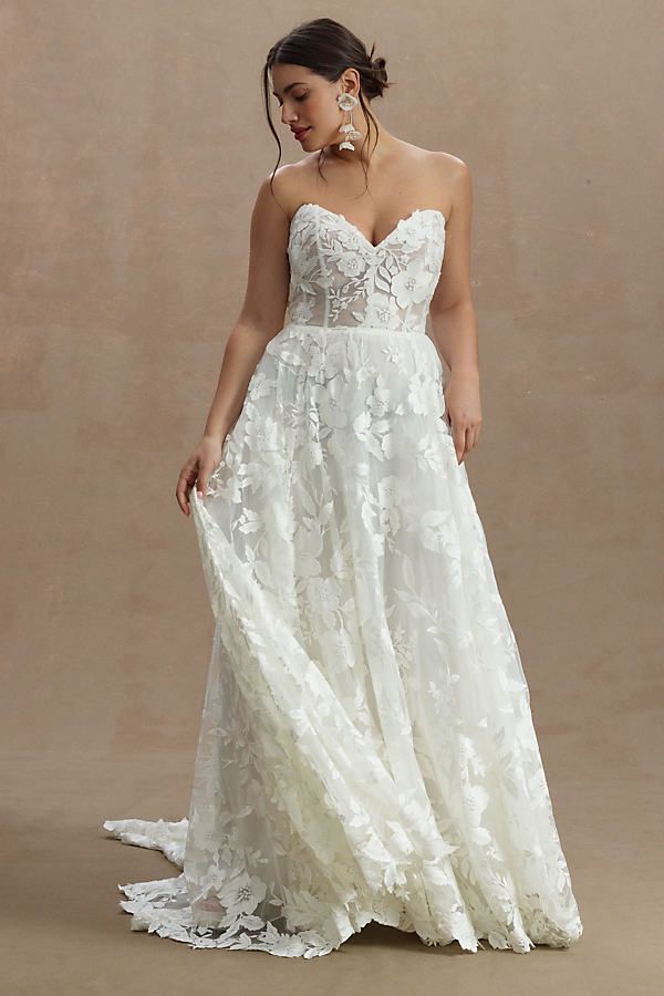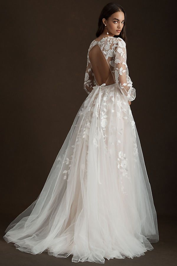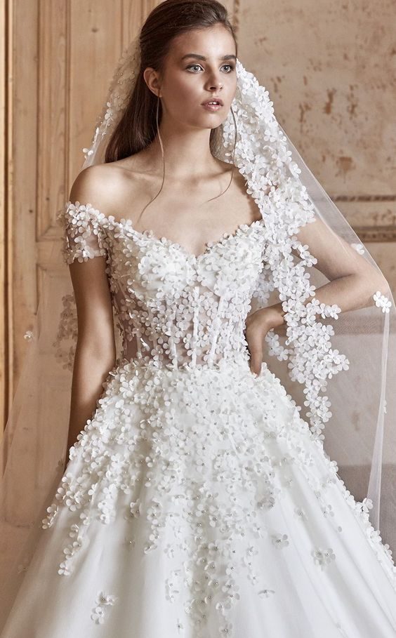 A garden of three-dimensional florals blooms over this masterpiece, a stunning representation of unique wedding dresses vintage lace. The sheer overlay and embellished details offer a contemporary take on the classic lace wedding gown, with petals and leaves cascading down to a dreamy tulle train. It’s a love letter to the romantic at heart, crafted for moments of awe.
