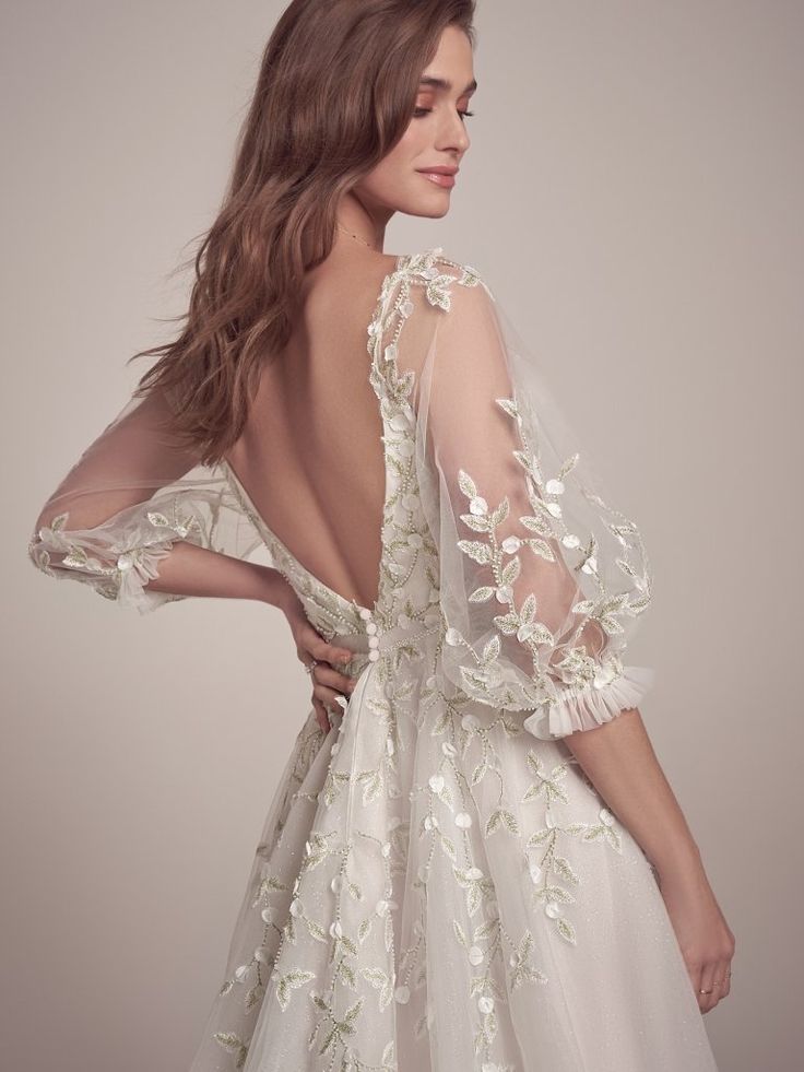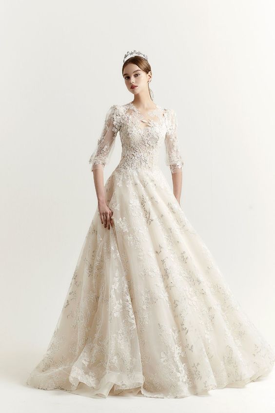 Turning away offers a breathtaking surprise with this gown’s daring back, surrounded by flowering embroidery that blooms into unique modest wedding dresses vintage beauty. The full sleeves and sheer details pay homage to an age of intricate craftsmanship, updated for the contemporary bride who seeks a modest dress with a hint of daring.