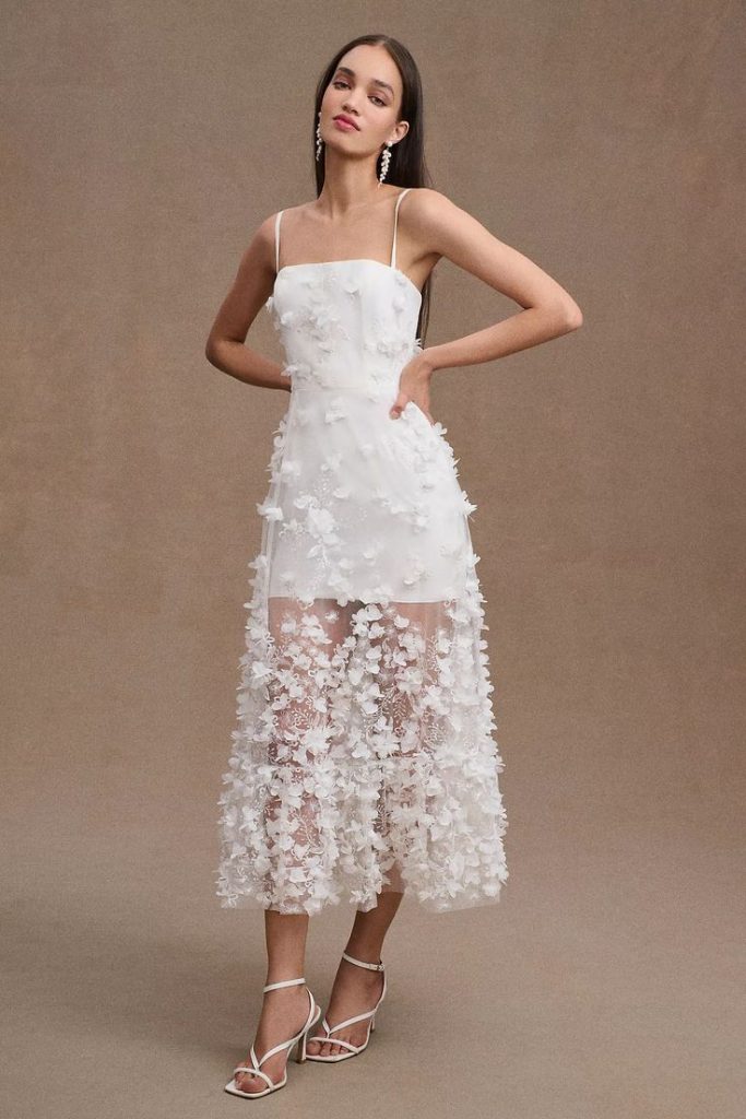 This dress is a celebration of the simple unique wedding dresses vintage trend. Its sheer bodice and layered skirt combine transparency with texture, adorned with vintage-inspired florals for a touch of nostalgia. The midi-length is a nod to the mod era, appealing to the bride seeking simplicity without sacrificing personality.