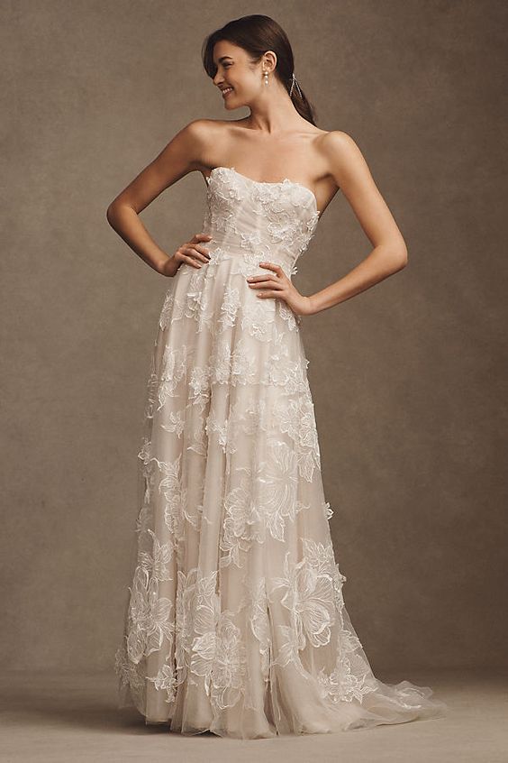 Antique lace envelopes this dress in a timeless embrace, an ode to unique wedding dresses boho vintage style. The strapless design and full skirt are reminiscent of bygone elegance, while the lightness of the fabric and unstructured silhouette whisper boho-chic. This gown is for the bride who treasures the past but lives fiercely in the present.