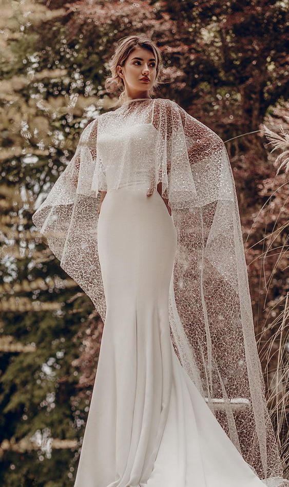 The sleek lines of this gown are enhanced by a sheer cape of delicate lace, perfect for the bride inspired by 1920s elegance. This dress, with its form-fitting silhouette and flowing cape, is the epitome of simple yet elegant bridal fashion, speaking to the soul of vintage minimalism.