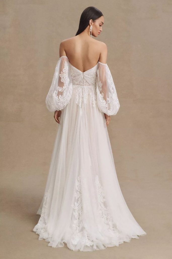 For the free-spirited bride, unique wedding dresses boho vintage resonate deeply. This dress, with its off-shoulder design and flowing sleeves adorned with lace, infuses bohemian charm with vintage flair, ideal for an intimate garden or beach wedding.