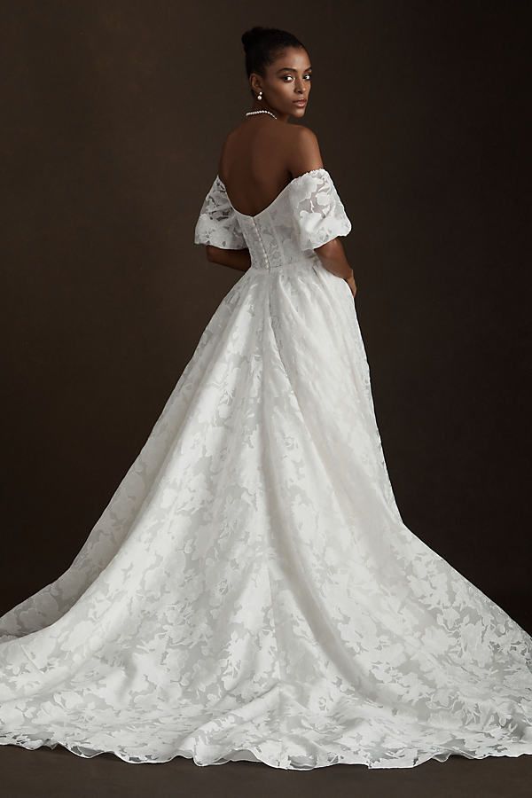 Drawing inspiration from the ornate fashions of the Victorian era, this gown is a masterpiece of design. Its corseted bodice and voluminous skirt embody the unique wedding dresses vintage victorian aesthetic, while the modern off-shoulder neckline adds a contemporary edge.