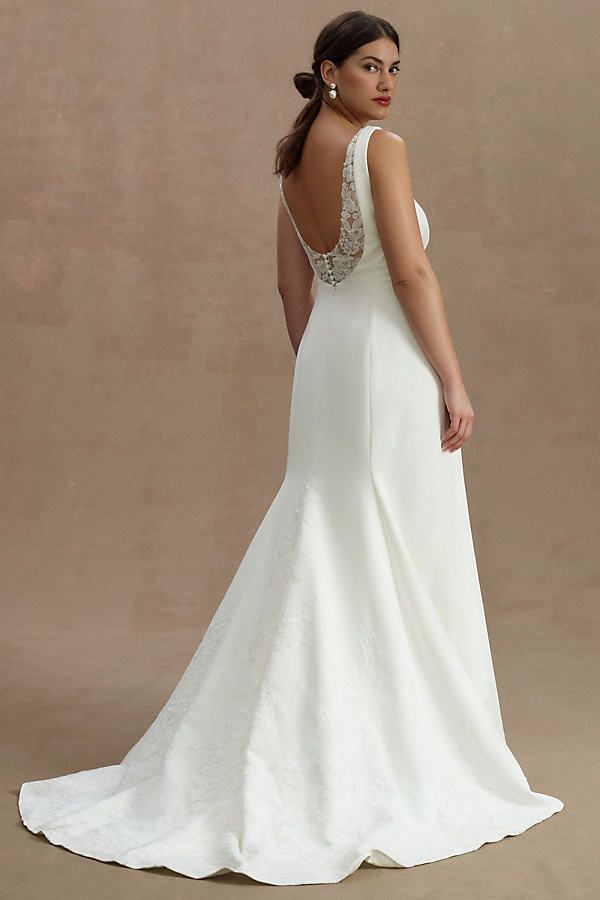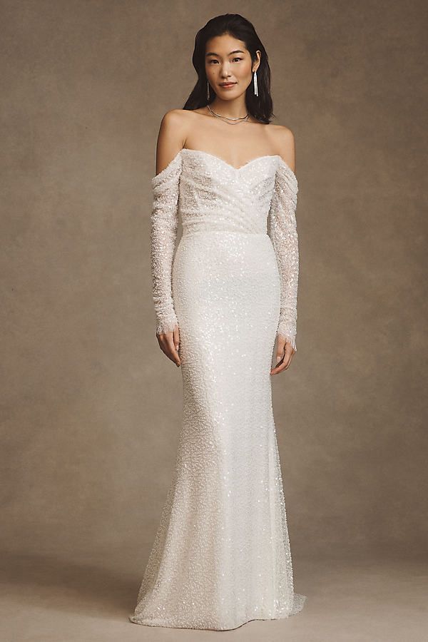 Channeling the roaring twenties, this gown with its beadwork and dropped waist is an ode to the 1920 inspired wedding. Its sheer sleeves and embellished details offer a nod to the past while appealing to the contemporary bride looking for that unique wedding dress vintage twist.