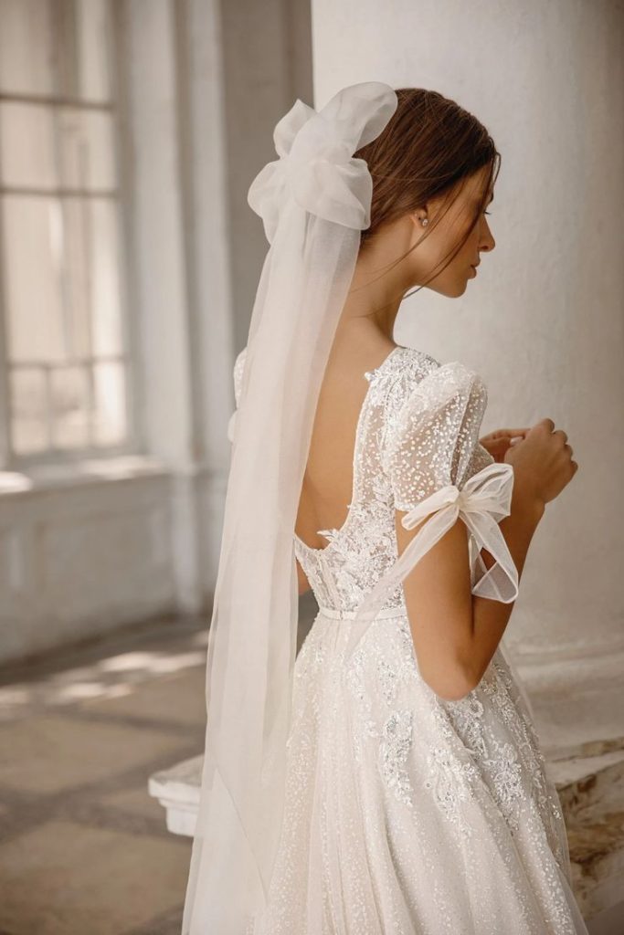 Capturing the essence of unique wedding dresses vintage elegant, this backless gown with a graceful train and intricate lace detailing exudes a serene sophistication. It’s a dress that whispers rather than shouts, perfect for the bride who embodies understated elegance.