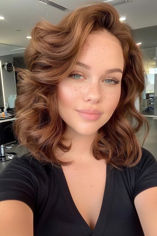 This glamorous, voluminous hairstyle features soft waves and a golden brown hue. The shoulder-length cut enhances natural curls, giving a bouncy, youthful look that adds texture and dimension, perfect for both casual and formal occasions.