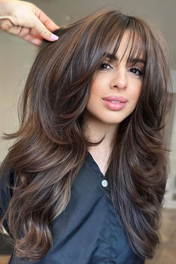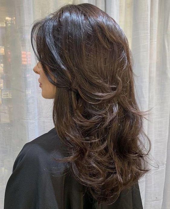 This classic layered cut features long, feathered strands with curtain bangs for a flowing, dynamic look. The rich brunette tones add depth, while the layers frame the face, giving a soft and sophisticated vibe ideal for any season.