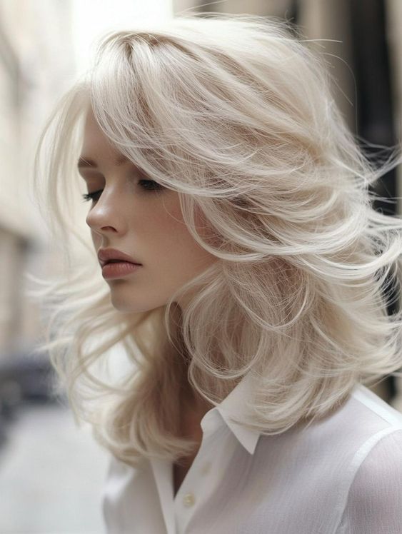 A chic, platinum blonde hairstyle with feathered layers that add dimension and texture. The soft, face-framing layers create a light, airy appearance, giving the look a sophisticated and modern edge. Perfect for those who prefer an elegant yet trendy style.