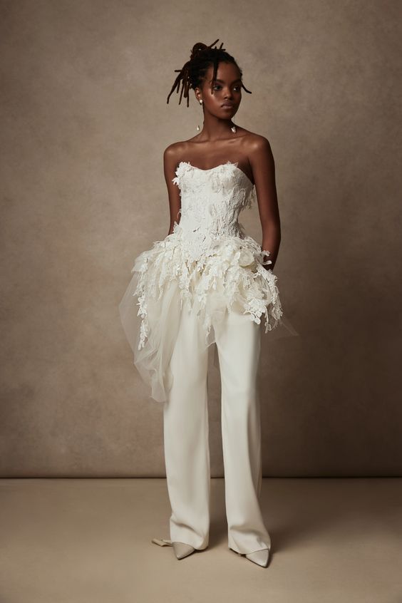 Who says a wedding dress has to be a dress? This jumpsuit with floral appliqués redefines bridal wear for the black woman wedding dress aesthetic, perfect for the bride who marches to the beat of her own drum.