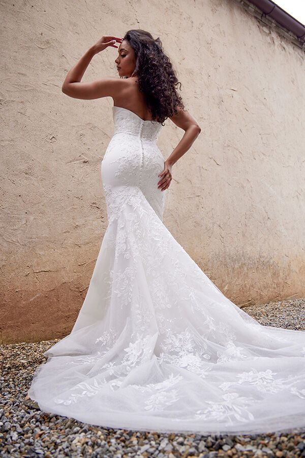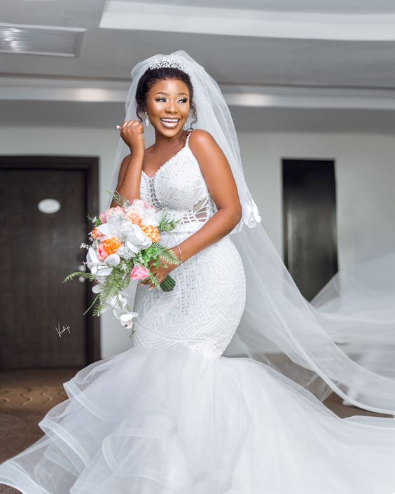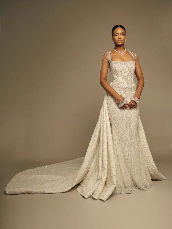 This dress is the quintessence of luxury wedding dress black woman, with meticulous beadwork and an impressive mermaid tail. The fitted bodice and sleeves, combined with a dramatic skirt and veil, create a vision of regal grace, making the bride the undeniable centerpiece of her wedding day.
