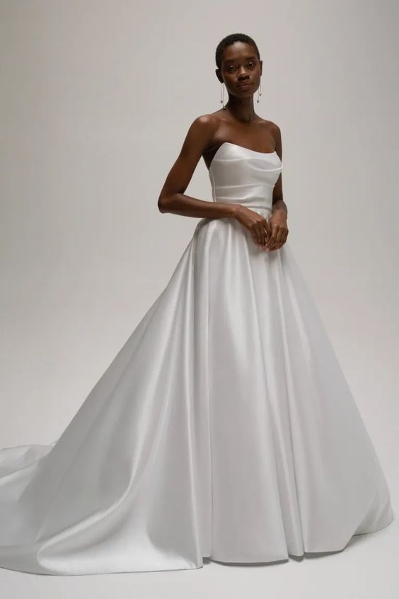 Structured simplicity is the hallmark of this strapless gown. Its clean lines and smooth fabric speak to a black woman in wedding dress who finds beauty in minimalism. Paired with a statement headband, it’s a nod to understated elegance.