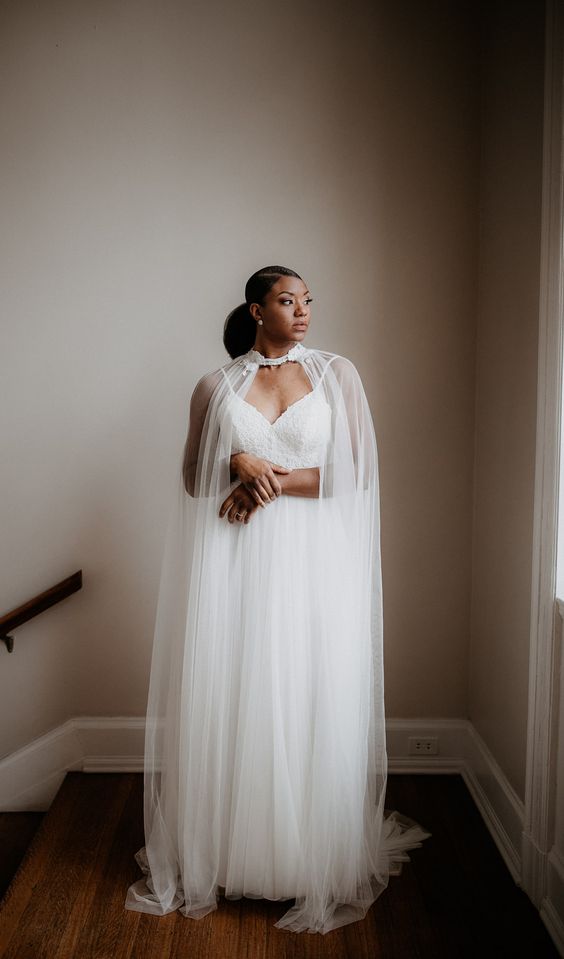 This gown, with its soft tulle and lace, radiates a serene, ethereal beauty. It’s perfect for the bride who desires a boho wedding dress black woman look, with a hint of traditional bridal aesthetics. The subtle train adds a touch of majesty without overwhelming the delicate design.