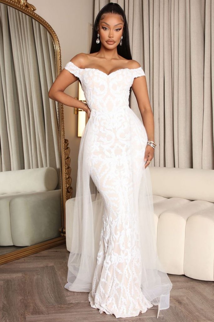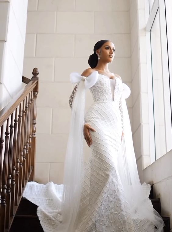 This wedding dress black woman 2024 design exudes a blend of traditional and contemporary elements. The off-shoulder neckline showcases the collarbone and shoulders gracefully, while the fitted bodice flows into a mermaid skirt, highlighting the silhouette. The dress is a statement of luxury wedding dress black woman elegance with its intricate lace and sweeping train.