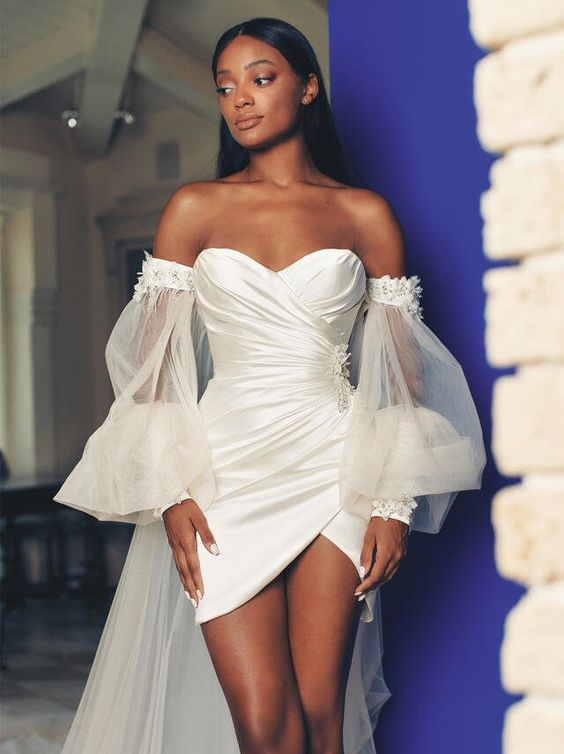 Defying conventions, this short white bridal dress is for the woman who owns her style. The sculptural bodice paired with ruffled layers gives a playful yet classy elegant wedding dress black woman vibe. It’s a bold choice for a second dress or a modern wedding setting.